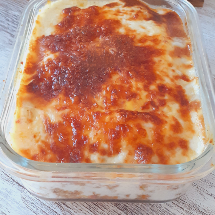 Num tabuleiro/pirex colocar um pouquinho de carne com molho no fundo e por cima uma "placa" (ou duas dependendo do tamanho do recipiente. Deitar umas colheradas de carne e um pouco de molho branco, colocar outra "placa" e repetir tudo até acabar a carne (a última camada deve ser uma "placa"). Regar com o resto do molho branco salpicar com mais um pouco de queijo ralado e levar a gratinar no forno ou na air fryer.